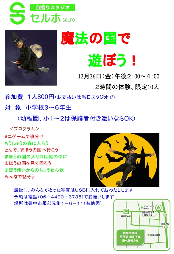 セルホは12月26日、お子様向けに冬休み子ども体験会「魔法の国で遊ぼ」を催します。対象は小学校3年生~6年生です(小学1、2年生及び幼稚園児は保護者の同伴があれば参加できます)。セルホのクロマキー自撮りを使って、魔法の国に向かうために課されるいろいろな難題をクリアして、最後は魔法使いと対決します。