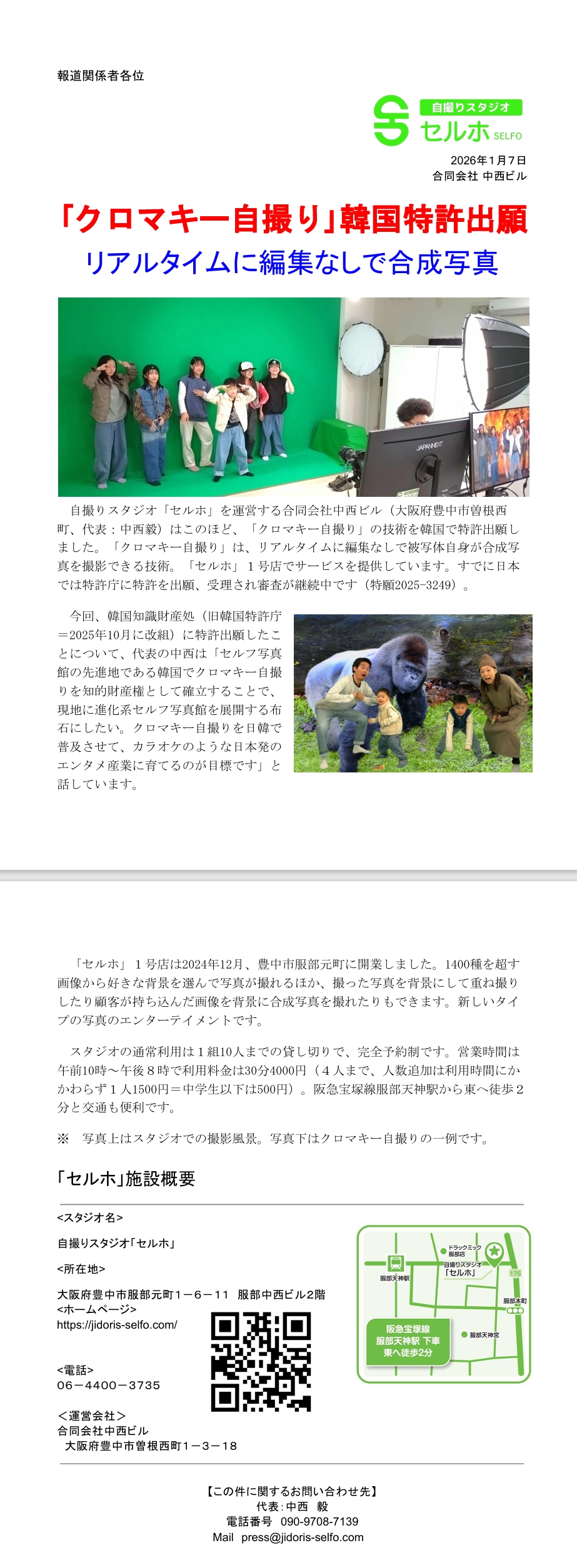 クロマキー自撮り、韓国でも特許出願 2026 1/07 ニュースリリース 2026年1月7日 自撮りスタジオ「セルホ」を運営する合同会社中西ビルはこのほど、リアルタイムに編集なしで被写体自身が合成写真を撮れる「クロマキー自撮り」のシステムを韓国でも特許出願いたしました。以下のニュースリリースを出しております。 クロマキー自撮り、韓国でも特許出願ダウンロード ニュースリリース URLをコピーしました! 明けましておめでとうございます 1月8日(木)は臨時休業